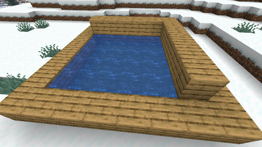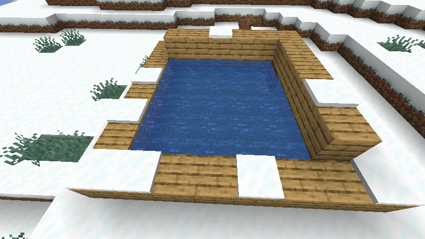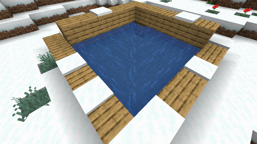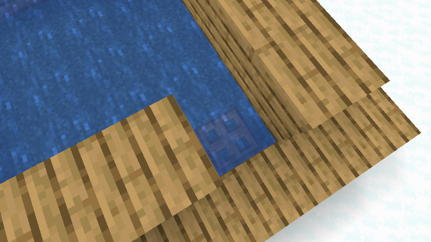 그 다음 물 블록의 두 가장자리 위에 이런식으로 블록을 위에 올려줍니다. 이러면 물 소스 블록을 덮는 셈이니 나무 블록 밑에 있는 물은 얼지 않겠죠?
