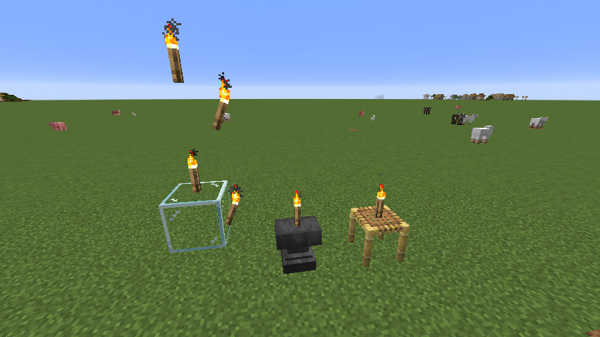 횃불은 블록의 옆면이나 윗면에 붙일 수 있습니다. 그런데 위, 옆쪽 둘 다 횃불을 설치할 수 있는 블록이 있고, 위만 되거나 옆만 되는 블록이 있고, 아예 설치가 안되는 블록도 있습니다. 또 버전마다 설치 가능 여부가 바뀌기도 합니다.