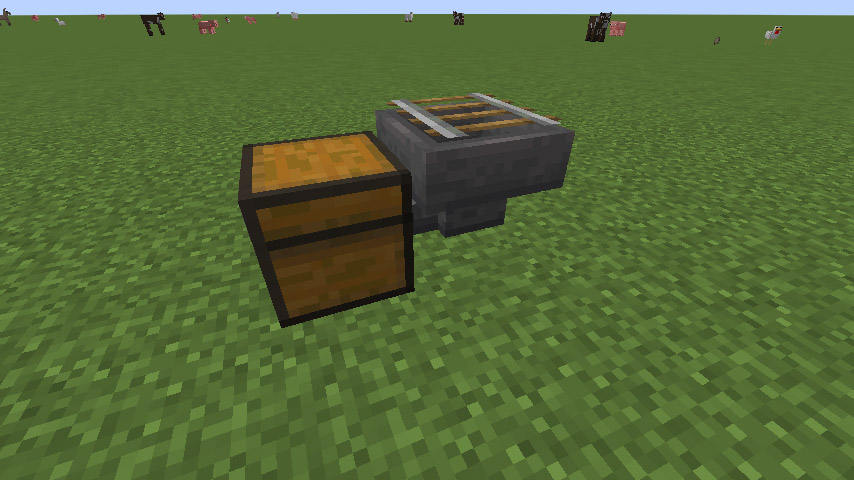 2. 레일 위에 호퍼가 실린 마인카트를 놓습니다.