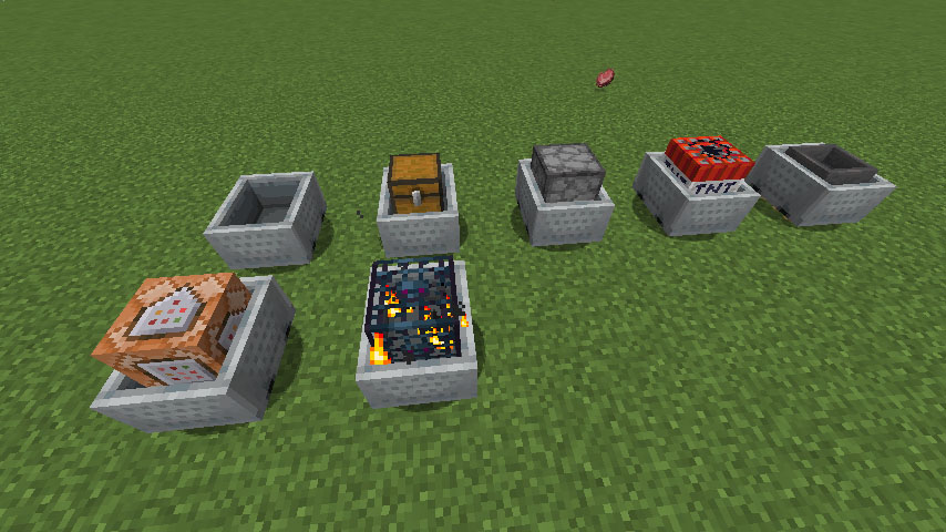 위 사진에서 윗 줄은 왼쪽부터 광산 수레, 상자가 실린 광산 수레, 화로가 실린 광산 수레, TNT가 실린 광산 수레, 호퍼가 실린 광산수레입니다. 밑 줄은 명령 블록이 실린 광산수레, 스포너가 실린 광산수레입니다.