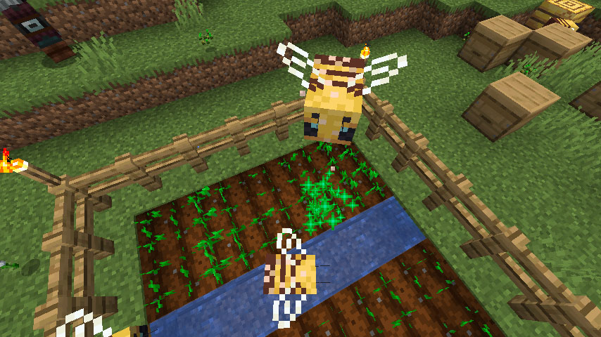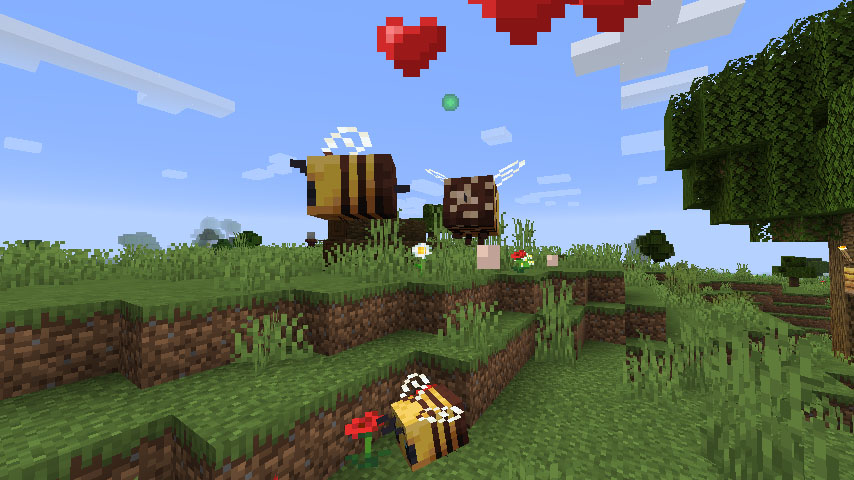 꿀벌 두마리한테 꽃을 먹이면 교배를 해서 새끼 꿀벌을 낳습니다. 원래 여왕벌이 알을 낳아서 애벌레를 일벌이 키워서 비로소 벌 성체가 되는 거지만 뭐 마인크래프트니까.. 단순하게 만든 것 같네요.