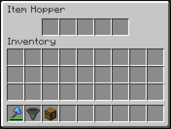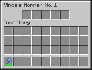 호퍼는 5칸의 인벤토리를 가집니다. 기본적으로 Item Hopper라고 이름이 붙어져 있는데, 모루를 사용하거나 커맨드를 사용해 변경할 수 있습니다.