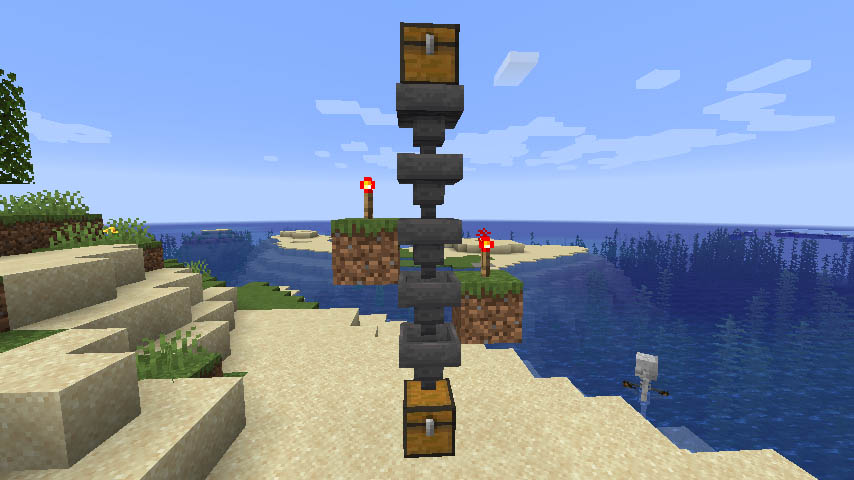 따라서 세로방향 호퍼 파이프를 중단시키려면 두 개의 호퍼에 레드스톤 신호를 줘야 합니다. 가로 방향 호퍼 파이프를 중단시키려면 한개만 신호를 줘도 됩니다.