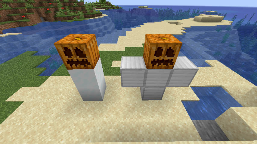 호박은 어느 방향으로 놓아도 블록 방향이 동일한데, 조각된 호박은 얼굴 위치에 따라 달라집니다. 블록 윗면을 보면 확인할 수 있습니다.