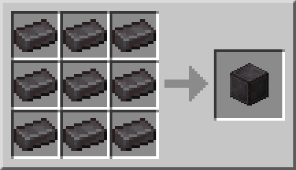 주괴를 9개 조합하면 네더라이트 블록(Block of Netherite)이 나오는데 신호기 밑에 놓는 용도로 사용합니다. 네더라이트를 주괴 9개로 다시 분해할 수도 있습니다.
