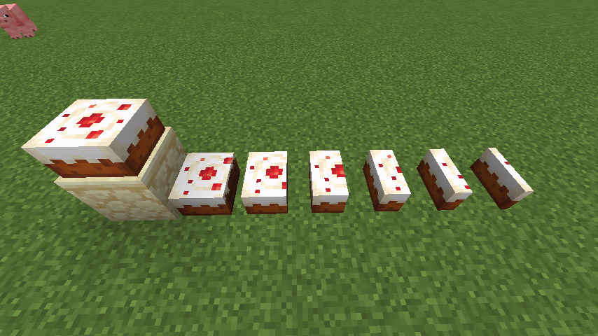 다른 음식과는 다르게 블록처럼 설치한 뒤 우클릭으로 먹을 수 있습니다. 케이크는 일곱 조각으로, 한 번 먹을 때마다 1/7씩 줄어듭니다. 한 조각당 허기 회복량은 2(고기 1칸), 포만감은 0.4로 그렇게 효율이 좋지는 않습니다.